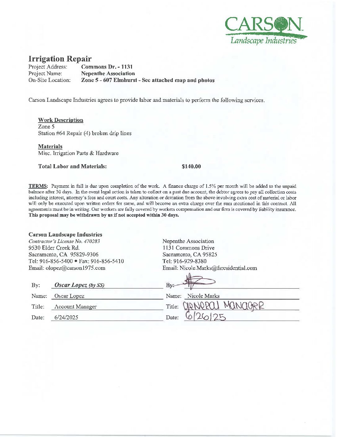 Carson Landscape – Irrigation Repairs – Zone 5, Station 64 by Nicole Marks | Jul 8, 2025 Download Filename: 28-1.pdf File Type: pdf Categories: 2025 Approved Contracts/Proposals, Carson Landscape