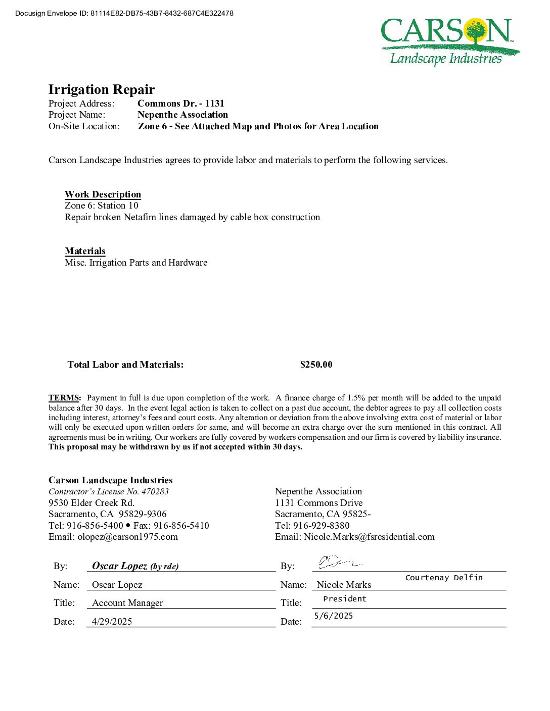 Carson Landscape – Irrigation Repairs – Zone 6, Station 10 by Nicole Marks | May 13, 2025 Download Filename: 91.pdf File Type: pdf Categories: 2025 Approved Contracts/Proposals, Carson Landscape